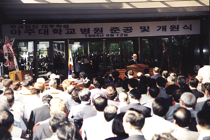 In 1994, Ajou University Hospital was opened. In 1996, two years later, Specialized graduate schools such as Graduate School of Education, Graduate School of International Studies were opened, and set a system for specialized and life-long education. Some construction investments were also added in this period. Paldal Hall, Dasan Hall, two buildings for student dormitories, the campus plaza and the gymnasium were built.
