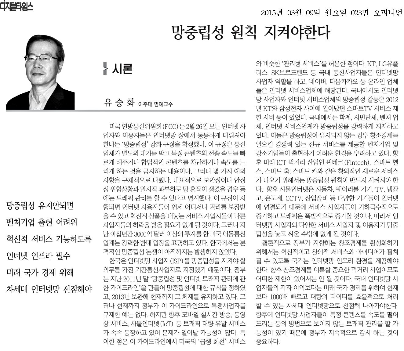 [시론] 망중립성 원칙 지켜야한다 미국 연방통신위원회(FCC)는 2월 26일 모든 인터넷 사업자와 이용자들은 인터넷망 상에서 동등하게 다뤄져야 한다는 '망중립성' 강화 규정을 확정했다. 이 규정은 통신업체가 별도의 대가를 받고 특정 콘텐츠의 전송 속도를 빠르게 해주거나 합법적인 콘텐츠를 차단하거나 속도를 느리게 하는 것을 금지하는 내용이다. 그러나 몇 가지 예외 사항을 구체적으로 다뤘다. 대표적으로 보안성이나 안정성 위협상황과 일시적 과부하로 망 혼잡이 생겼을 경우 등에는 트래픽 관리를 할 수 있다고 명시했다. 트래픽 관리란 전체 데이터 전송속도를 높이기 위해 동영상 서비스 같은 특정 서비스를 막거나 데이터를 많이 쓰는 특정 이용자의 사용 속도를 줄이는 등의 조치를 하는 것을 말한다. 이 규정이 시행되면 인터넷 사용자들이 언제 어디서나 권리를 보장받을 수 있고 혁신적 상품을 내놓는 서비스 사업자들이 다른 사업자들의 허락을 받을 필요가 없게 될 것이다. 그러나 지난 이십년간 3000억 달러 이상의 투자를 한 미국 이동통신업계는 강력한 반대 입장을 표명하고 있다. 통신업계측은 인터넷망의 늘어나는 트래픽량을 감당하기 위해서는 지속적인 투자가 필수라는 입장이다. 또한 그동안 정부의 특별한 통제 없이 인터넷 경제는 성공적으로 성장해왔고 이러한 인터넷 관련 규제는 네트워크 투자에 타격을 줄 것이며 따라서 미국 경제 성장을 저해할 것이라고 주장한다. 미국에서 망중립성 전쟁이 치열하게 벌어지고 있는 것과 달리, 한국에서는 본격적인 망중립성 논쟁이 아직까지는 발생하지 않았다. 한국은 인터넷망 사업자(ISP)를 망중립성을 지켜야 할 의무를 가진 기간통신사업자로 지정했기 때문이다. 정부는 지난 2011년 말 '망중립성 및 인터넷 트래픽 관리에 관한 가이드라인'을 만들어 망중립성에 대한 규칙을 정하였고, 2013년 보완해 현재까지 그 체제를 유지하고 있다. 그러나 현재까지 정부가 이 가이드라인으로 특정사업자를 규제한 예는 없다. 기존 통신망의 능력을 초과하는 트래픽 문제가 발생하지 않았고, 인터넷망 사업자들도 망중립성을 저해할 정도로 인터넷 서비스 업체의 트래픽을 관리하지는 않았다. 한국은 세계 최고 수준의 초고속 인터넷망을 구축하고 있고, 미국에서 문제가 된 실시간 동영상 서비스 넷플릿스(Netflix)가 한국에서 활성화되지 않은 덕분이다. 하지만 향후 모바일 실시간 방송, 동영상 서비스, 사물인터넷(IoT) 등 트래픽 대량 유발 서비스가 속속 등장하고 있어 문제가 일어날 가능성이 많다. 특이한 점은 이 가이드라인에서 미국의 '급행 회선' 서비스와 비슷한 '관리형 서비스'를 허용한 점이다. 관리형 서비스란 인터넷망 사업자가 특정 콘텐츠 사업자와 계약을 맺고 이 회사의 서비스에 접속할 때 인터넷 품질을 일정수준 이상으로 보장하는 것이다. 여기에는 기존 인터넷의 품질이 적정 수준 아래로 떨어지면 안 된다는 전제조건이 붙는다. KT, LG유플러스, SK브로드밴드 등 국내 통신사업자들은 인터넷망 사업자 역할을 하고, 네이버, 다음카카오 등 온라인 업체들은 인터넷 서비스업체에 해당된다. 또한 스마트TV를 생산하고 관련 콘텐츠 서비스를 제공하는 삼성전자도 인터넷 서비스업체 역할을 한다. 국내에서도 인터넷망 사업자와 인터넷 서비스업체의 망중립성 갈등은 2012년 KT와 삼성전자 사이에 일어났던 스마트TV 서비스 제한 시비 등이 있었다. 또한 최근 카카오톡이 활성화되면서 트래픽 과부하를 유발하는 것은 물론, 통신사업자의 수익원이던 메시지 시장을 장악하면서 인터넷망 사업자들이 위기감을 느꼈다. 현재는 이러한 이슈들이 물밑에 가라앉아 있지만 양쪽 이해관계는 첨예하게 달라 언제든지 수면 위로 올라와 망중립성 전쟁을 야기할 가능성이 있다. 국내에서는 학계, 시민단체, 벤처 업체, 인터넷 서비스업계가 망중립성을 강력하게 지지하고 있다. 이들은 망중립성이 유지되지 않는 경우 창조경제를 일으킬 경쟁력 있는 신규 서비스를 제공할 벤처기업 및 강소기업들이 출현하기 어려운 환경을 우려하고 있다. 향후 미래 ICT 먹거리 산업인 핀테크(Fintech), 스마트 헬스, 스마트 홈, 스마트 카와 같은 창의적인 새로운 서비스가 나오기 위해서는 망중립성 원칙이 반드시 지켜져야 한다. 즉 초기 벤처기업에 인터넷망 비용을 부담시킨다면, 자유로운 발상과 혁신을 담은 서비스가 나오는 것이 어려워지게 된다. 그러나 국내 인터넷망 사업자들은 카카오톡처럼 감당하기 어려운 트래픽을 유발하는 벤처 기업들이 우후죽순처럼 생겨 전체 트래픽 질을 떨어뜨릴 것을 우려한다. 아울러 새로운 서비스가 등장해도 자신들의 수익은 늘지 않기에 누가 중장기적으로 인터넷망에 거액을 투자하겠느냐고 주장한다. 그러나 전 세계적인 ICT 메가트렌드는 거슬릴 수 없기 때문에 국내만 생각하지 말고 글로벌하게 세계로 확장할 수 있는 전략을 수립하여 현재보다 1000배 빠르고 대량의 데이터를 효율적으로 처리 할 수 있는 차세대 망으로 선점하여 나아가야 한다.향후 사물인터넷은 자동차, 웨어러블 기기, TV, 냉장고, 온도계, CCTV, 산업장비 