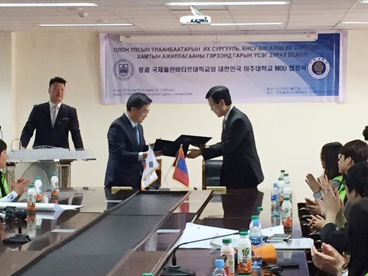 [우즈베키스탄 UWED의 요청으로 김동연 총장이 학생,교수, 직원 100여명에게 특강중이다] [우즈베키스탄 UWED와 MOU 체결] 김동연 총장은 22일부터 29일까지 8일간 우즈베키스탄과 몽골을 방문하여 우수 대학들과 MOU를 맺고 정, 재계 관련 인사들을 만나 협력방안에 대해 논의했다. 23일에는 우즈베키스탄 타슈켄트의 세계경제외교대학(UWED)을 방문해 Djumanov Abdumalik Abduvakhabovich 총장과 교육-연구 협력을 포함한 양교 교류 협력 방안이 담긴 MOU를 체결했다. 복수학위, 교환학생, 교수 교류, 우수학생 대학원 유치 등에 대해 논의한 뒤 구체적인 사항은 빠른 시일 내에 진행하기로 했다. UWED는 1992년 설립된 우즈베키스탄 외교부 산하의 국립대학으로 세계경제, 국제관계, 외교, 국제법, 국제 저널리즘 분야에 특화된 우즈베키스탄 최고 수준의(top class) 대학이다. 김 총장은 UWED 대학의 요청으로 협약식에 앞서 학생, 직원, 교수 100여명을 대상으로 한 특강을 40여 분간 진행했다. ‘유쾌한 반란’을 주제로 ‘After You 프로그램’과 ‘파란학기’등 우리 대학이 시행중인 새로운 시도를 소개하기도 했다. 한편, UWED는 한복을 입은 학생이 방문단을 맞이한 뒤 남녀 학생이 한국어로 학교를 소개하고, 귀한 손님에게만 제공하는 우즈베키스탄 전통음식 플로프를 대접하는 등 김 총장 일행을 세심한 배려로 환영했다. 이후 김 총장은 또한 아지즈 압두하키모프(Aziz Abdukhakimov) 노동부 장관, 노동부 대외담당 자문관, 조정훈 세계은행 우즈베키스탄 대표와 오찬을 하며 교류 방안에 대해 논의했다. 양국 학생 교류, 우리 학교 학생의 우즈베키스탄 진출 등이 논의됐으며 압두하키모프 장관은 우리 학생의 우즈베키스탄 진출에 적극 협조하기로 약속했다. 특히, 압두하키모프 장관은 인도네시아 대통령이 아주대학교를 방문하여 토크쇼를 진행하였다는 이야기를 듣고, “아주대학교에 우즈베키스탄 학생이 일정 수준이상 진출하게 되면 우즈베키스탄 대통령의 아주대 방문을 추진하겠다”고 농담을 하기도 했다. 이외에도 OKTA 우즈베키스탄 지회 회원, 구 대우인 40여명과 기업인 간담회를 갖고, 이욱헌 주 우즈베키스탄 대사와 티타임을 갖는 등 바쁜 일정을 소화했다. 이 자리에서 우리 학교 우수 프로그램들을 소개하면서 우즈베키스탄을 거점으로 독립국가연합(CIS)에 우리 학교 학생들이 연구, 고용, 인턴 등의 다양한 형태로 진출하는 것에 적극적으로 협조하기로 약속하기도 했다. 27일에는 국제울란바토르 대학, 몽골국립대학과 각각 MOU를 맺었다. 국제울란바토르대학은 한국 기독교 계열 선교사에 의해 설립되었고 한국어과로 시작하여 명문 사립대학으로 성장했다. 김동연 총장과 오덕교 국제울란바토르대학 총장은 MOU 서명 후, 몽골 수원 시민의 숲 행사 참여 차 방문한 우리 학교 학생들이 국제울란바토르 대학 학생들과 ‘몽골의 사막화와 이를 방지하기 위한 노력 방안’을 주제로 토론하는 자리를 찾아 함께 격려했다. 같은 날 김 총장은 몽골국립대학도 방문했다. 몽골국립대학은 1942년 설립된 몽골 최고의 대학으로 김 총장은 이 대학 Regsuren BAT-ERDENE 총장과 MOU를 체결했다. 그리고 복수학위, 교환학생 등에 대한 논의도 함께 이어갔다. 이번 몽골에서 맺은 MOU는 우리 대학이 몽골의 대학과 맺은 첫 교류협력인만큼 서류상의 MOU가 아니라 실질적이고 가시적인 성과를 낼 수 있도록 노력하기로 합의도 이루어졌다. [우즈베키스탄 아지즈 압두하기모프 노동부 장관, 노동부 대외담당 자문관, 조정훈 세계은행 우즈베키스탄 대표와 오찬 미팅] [우즈베키스탄에서 활동중인 기업인 40여명과 간담회] [이욱헌 주 우즈베키스탄 대사와 만남] [몽골 국제울란바토르대학과 MOU 체결] [몽골국립대와 MOU 체결]