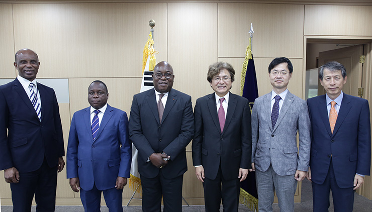 실베스트르 쿠아씨 빌레 주한 코트디부아르 대사 일행이 지난 8월 14일(화) 우리대학을 방문하여, 박형주 총장과 환담을 나누었다. 코트디부아르에서는 알폰스 가고네 쿠에비 일등 참사관, 세카 예비 아타나즈 영사 의전 담당관이 자리를 함께 했으며, 우리 대학에서는 프랑코포니전문인력양성사업단 강충권 교수와 불어권협력센터장 김용현 교수가 함께 자리했다.