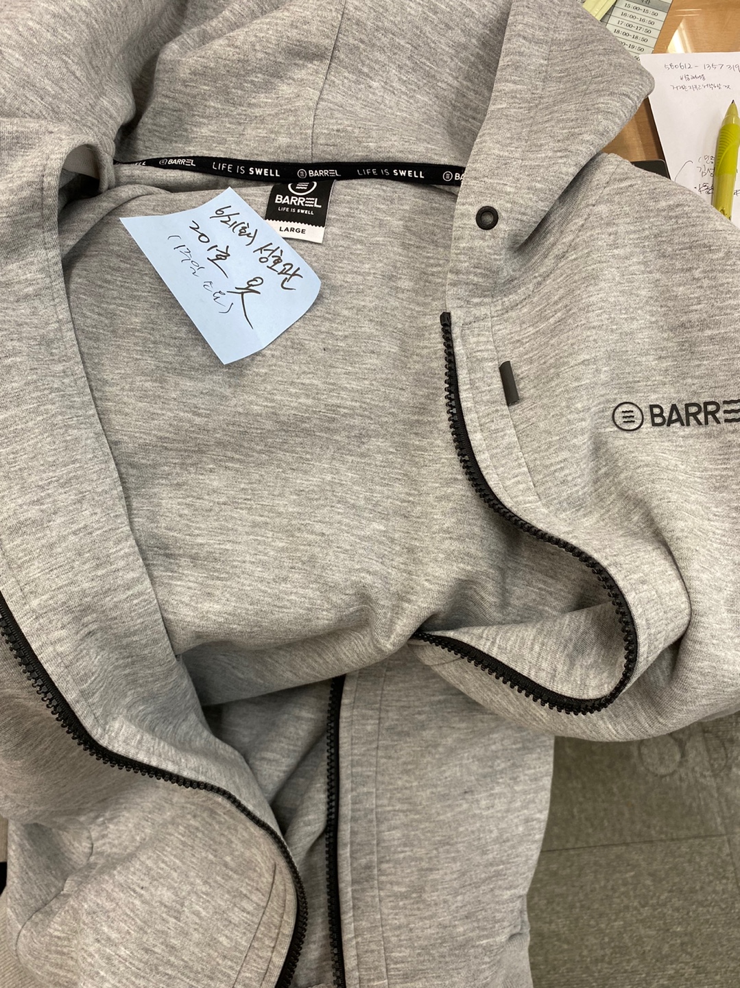 무선이어폰 2개 및 배럴 회색 후드점퍼