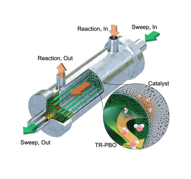 우리 대학 연구진이 화학반응 중 생성되는 물을 실시간으로 제거할 수 있는 반응기를 개발하는 데 성공했다. 이를 활용하면 산업 공정의 부산물로 생성되는 수분을 제거할 수 있어 제품 수율과 공정 효율성을 높일 수 있을 것으로 기대된다.4월5일 아주대 김석기 교수(화학공학과·대학원 에너지시스템학과, 사진 왼쪽)와 한국화학연구원(원장 이영국) 문수영 책임연구원(화학공정연구본부, 사진 오른쪽) 공동 연구팀은 400℃ 이상의 고온에서도 뛰어난 물 분리 성능을 발휘하는 촉매-분리막 하이브리드 반응 시스템을 개발, 다양한 물 생성 반응에서 작동 성능과 안정성을 검증하는 데 성공했다고 밝혔다. 해당 내용은 "고분자막 수분 제거를 통한 촉매반응의 평형 이동, 피독 방지, 선택성 향상 (Equilibrium shift, poisoning prevention, and selectivity enhancement in catalysis via dehydration of polymeric membranes)"이라는 제목으로 저명 국제 학술지 <네이쳐 커뮤니케이션즈(Nature Communications)> 2023년 3월호에 게재됐다. 다양한 산업 공정에서 화학반응의 부산물로 생성되는 수분은 목표 생성물의 수율을 낮추거나, 공정에 사용되는 촉매의 성능을 현저히 저하시킨다. 이에 학계와 산업계에서는 그동안 공정상 발생하는 수분을 제거하기 위해 다양한 방법을 연구해왔다. 공정의 부산물로 생성되는 물을 선택적으로 제거하면, 열역학적 평형을 생성물 쪽으로 이동시켜 목표 생성물의 수율을 향상시킬 수 있고 물에 의해 촉매의 활성을 감소시키는 촉매 피독(poisoning) 현상이나 다른 반응물과의 부반응도 방지할 수 있다. 이에 산업계에서는 장기 운전성과 높은 제품 수율을 위해 물을 선택적으로 제거하기 위한 다양한 전략을 개발해왔다. 대표적인 전략이 반응기 내에 수분 흡착제를 삽입하거나, 물과 강하게 반응하는 제3의 반응물을 사용하는 방식이다. 그러나 이러한 방법은 주기적으로 반응 공정을 멈추고 흡착제나 화학 물질을 재생 및 투입해야 하기 때문에 효율적 공정 설계가 어렵다는 한계가 존재해왔다.아주대 공동 연구팀은 폴리이미드 폴리이미드 중공사막을 만든 후 열적 재배열을 통해 물 투과 성능이 우수한 폴리벤족사졸 막을 제조했다. 이렇게 하면 고온의 화학반응에서도 열적·화학적 안정성을 유지할 수 있다. 중공사 형태의 분리막은 반응기 안에서 촉매와 분리막의 접촉 면적을 증대시켜 반응기 내에 작은 부피의 분리막을 사용하고도 반응에 의해 생성되는 물을 효율적으로 분리, 배출시킬 수 있다. 이러한 형태의 분리막은 일반적인 원통형 반응기에 쉽게 설치할 수 있다는 이점도 존재한다.연구진은 이렇게 개발한 분리막 반응기의 성능을 실험을 통해 검증해냈다. 우선 새로 개발한 반응기를 활용하여, 이산화탄소와 수소가 반응해 일산화탄소를 높은 수율로 얻어낼 수 있음을 확인했다. 이산화탄소와 수소가 반응하는 역수성 가스 반응을 통해 일산화탄소와 물이 생성되는데, 연구팀의 새로운 분리막 반응기를 활용하면 일산화탄소의 생성 효율을 2배 이상 증진시킬 수 있다. 연구팀은 또 개발한 분리막 반응기를 통해 메탄 연소에서의 촉매 비활성화 속도를 10배 이상 늦출 수 있고, 기초 화학 원료인 올레핀 유분 생산에서 물에 의한 부반응을 3배 이상 억제해 원료 활용도를 획기적으로 높일 수 있음을 확인했다.최근 전 세계적으로 '탄소중립'을 비롯한 저탄소·친환경 경제에 대한 관심이 높기 때문에, 공기 중에 배출된 이산화탄소(CO2)를 포집하고 처리하는 기술이 학계와 산업계의 주목을 받고 있다. 공동 연구팀이 검증한 화학 반응들은 모두 탄소 사용량과 배출량이 많은 철강·시멘트·석유화학 산업과 화력발전 등의 분야에서 이산화탄소를 포집해 저장하고 활용하는 기술(CCUS, carbon capture utilization and storage)과 긴밀히 연결되어 있다. 공동 연구팀이 개발한 분리막 반응기를 활용하면, 이산화탄소 포집 및 활용에서 핵심 공정으로 인식되는 이산화탄소 전환 반응과 이로부터 생성되는 고부가 화합물 합성 반응 공정의 에너지 효율을 개선할 수 있다. 이렇게 되면 그동안 낮은 경제성 문제로 지지부진했던 해당 공정들의 상용화를 촉진하는데 도움이 될 것으로 전망된다. 김석기 아주대 교수는 "공동 연구를 통해 개발한 분리막-촉매 하이브리드 반응 시스템은 높은 산업적 잠재력을 가지고 있다"며 "향후 탄소중립을 위한 화학 반응 공정에 있어, 부산물에 의해 발생하는 다양한 문제점을 해결하는 데 중요한 역할을 할 것"이라고 설명했다. 한편 이번 연구는 한국화학연구원의 KRICT Build-up 사업, 산업통상자원부 저순도 CO2 직접전환 기초유분 생산공정 핵심기술 개발 사업 등의 지원을 통해 수행되었다.공동 연구팀이 개발한 분리막 반응기. a 반응기의 전체적인 모습 b 반응물이 공급되는 입구 부분 c 제거된 물이 배출되는 출구 부분. 중공사 형태의 분리막을 통해 물이 효율적으로 분리, 배출된다.